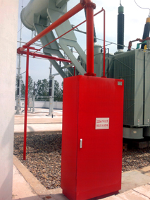 油浸变压器排油注氮灭火设备是由控制柜、消防柜、断流阀、排油管路、注氮管路等组成,用于油浸式变压器及油罐的具有防爆、防火和灭火功能的设备。排油管路连接在变压器上部,通过排油阀控制系统排油泄压,主要包括排油管道、排油阀、检修阀、伸缩接头等,排油阀的开启杠杆配有重锤并由两个个电磁铁控制,电磁铁由控制系统控制开启。注氮管路连接高压氮气瓶及变压器,通过氮气释放阀控制向变压器底部注入氮气,主要包括注氮管路、氮气释放阀、油气隔离组件、流量调节阀等。其灭火机理是:当变压器内部发生火灾或爆炸危险,控制系统启动重锤的电磁铁,重锤带动排油阀打开,开始排油,同时断流阀自动关闭,切断油枕向变压器本体供油,变压器油箱油位降低,油压减轻,防止变压器爆炸。经过数秒延时,控制系统再启动氮气释放阀,高压氮气瓶内的氮气通过注氮管路进入变压器油箱底部,充入变压器本体,充分搅拌本体内的变压器油,使油温降至燃点以下,避免火灾危险。断流阀的作用是排油注氮装置进行事故快速排油时,自动切断油枕与本体油箱之间的油流,防止“火上浇油”。