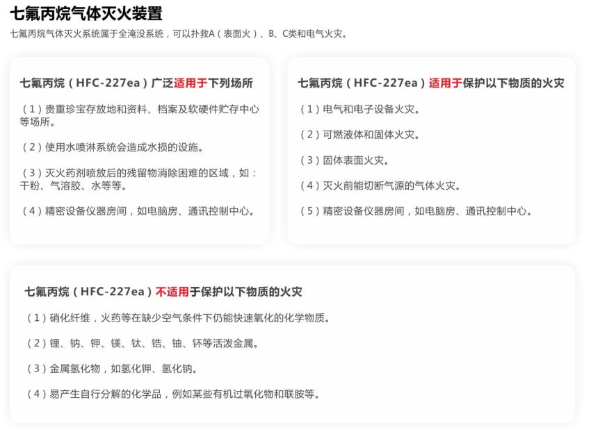 2.七氟丙烷(HFC-227ea)灭火剂具有灭火性能高,对设备无污损,电绝缘性好,灭火迅速等特点。