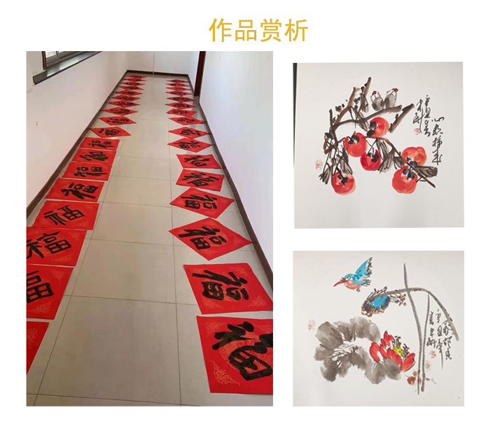 在书写现场,几位书法家挥毫泼墨,一页页红彤彤的福字煞是好看,一张张 秀气的花鸟画活泼灵动春意盎然,一幅幅对联在秀丽颀长特别应景。